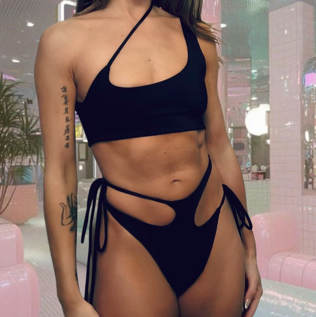 Features a sharp asymmetrical neckline and a chest cutout that frames the body like negative space art. Be sure to wear the thin strap across the chest on the same side as the thicker strap. Designed to contour the bust while leaving skin intentionally exposed. Minimal and quietly dominant.