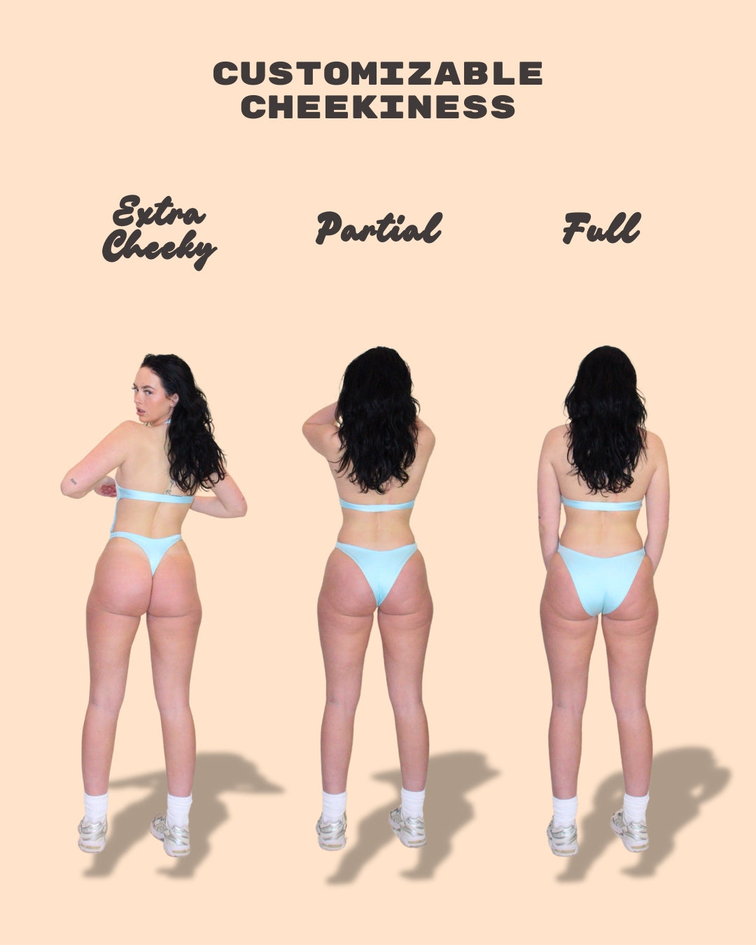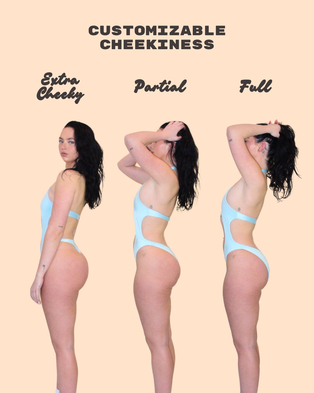 The Quinn One-Piece features a choker design with tapered straps and cutouts. This design is available in extra cheeky, partial and full coverage options (Specify in the Notes section)