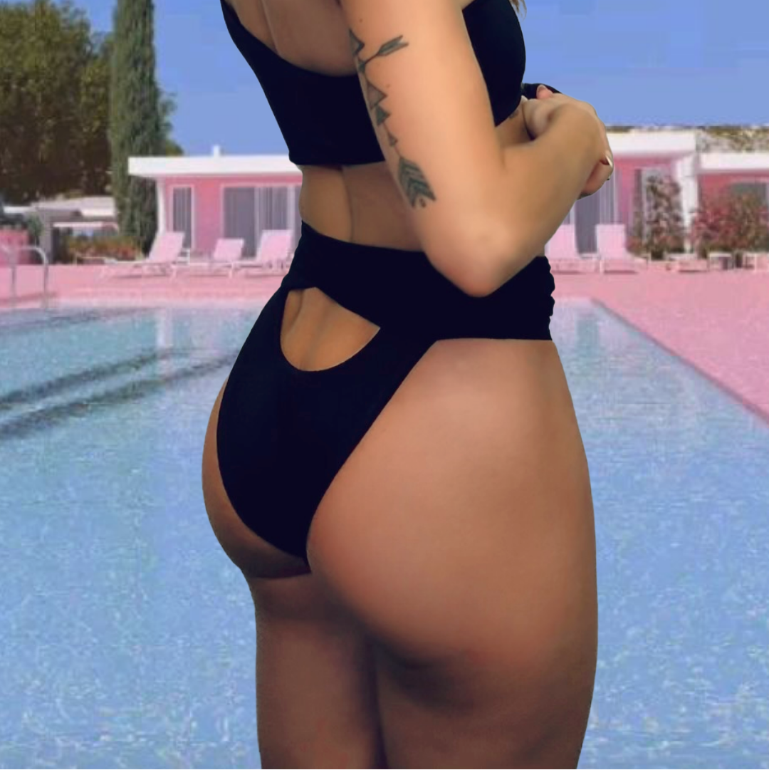 A high-rise silhouette with small cutouts in the front and back just under our ruched and twisted waistband. Partial to fuller booty coverage. Subtly cinches the waist.